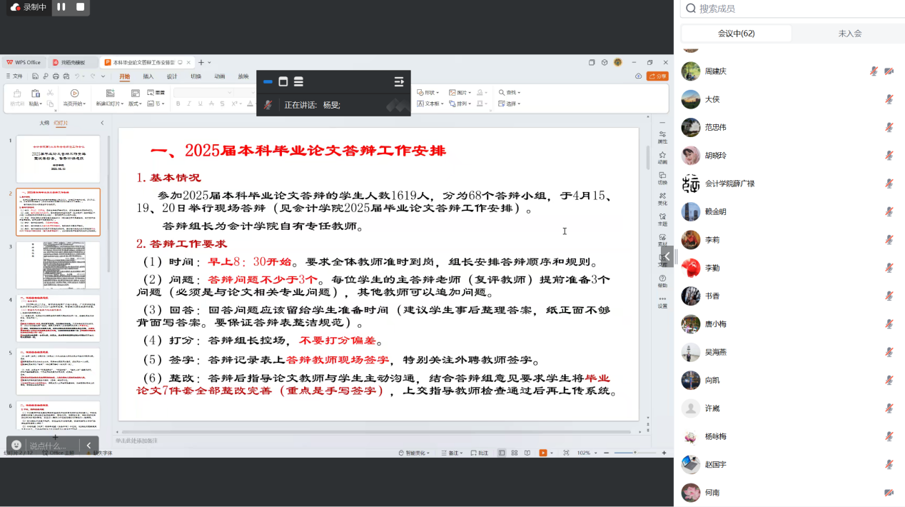 会议伊始,杨旻副院长强调了本科毕业论文答辩工作的重要性,指出毕业论文是学校人才培养的重要环节,也是教育部本科教育教学合格评估的重要内容之一。杨旻副院长介绍了本次毕业论文答辩工作的整体安排,并结合我院往届学生在本科毕业论文答辩工作中存在的问题与经验,从答辩时间、答辩流程、提问回答、成绩评定、材料归档等方面对答辩工作做了全面且细致的说明。她强调了答辩老师的主要职责与要求,提醒答辩老师做好充分准备,明确校内教师与外聘教师要加强沟通协作,在论文预审、答辩提问等环节精密配合,保障答辩工作顺利推进。