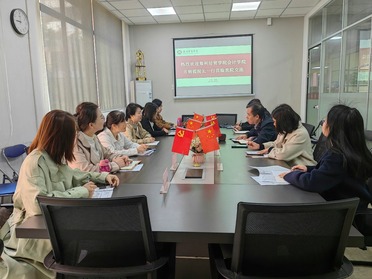 交流会伊始,姚凤民院长及齐明霞院长分别介绍了双方出席交流会的领导及老师。姚凤民院长对齐明霞院长一行的到来表示热烈欢迎,并向参加交流会的女同胞致以“三八妇女节”节日问候。随后介绍了华商教育集团、广州华商学院及广州华商学院国产又黄又猛的基本情况。详细介绍了华商国产又黄又猛的办学历史、国家级一流本科专业建设点建设、广东省一流本科专业建设点建设、会计学省级特色重点学科建设、省级一流课程建设、实验与实践教学体系建设、办学特色、产教融合、云会计产业学院建设、师资队伍建设、学生规模等情况。