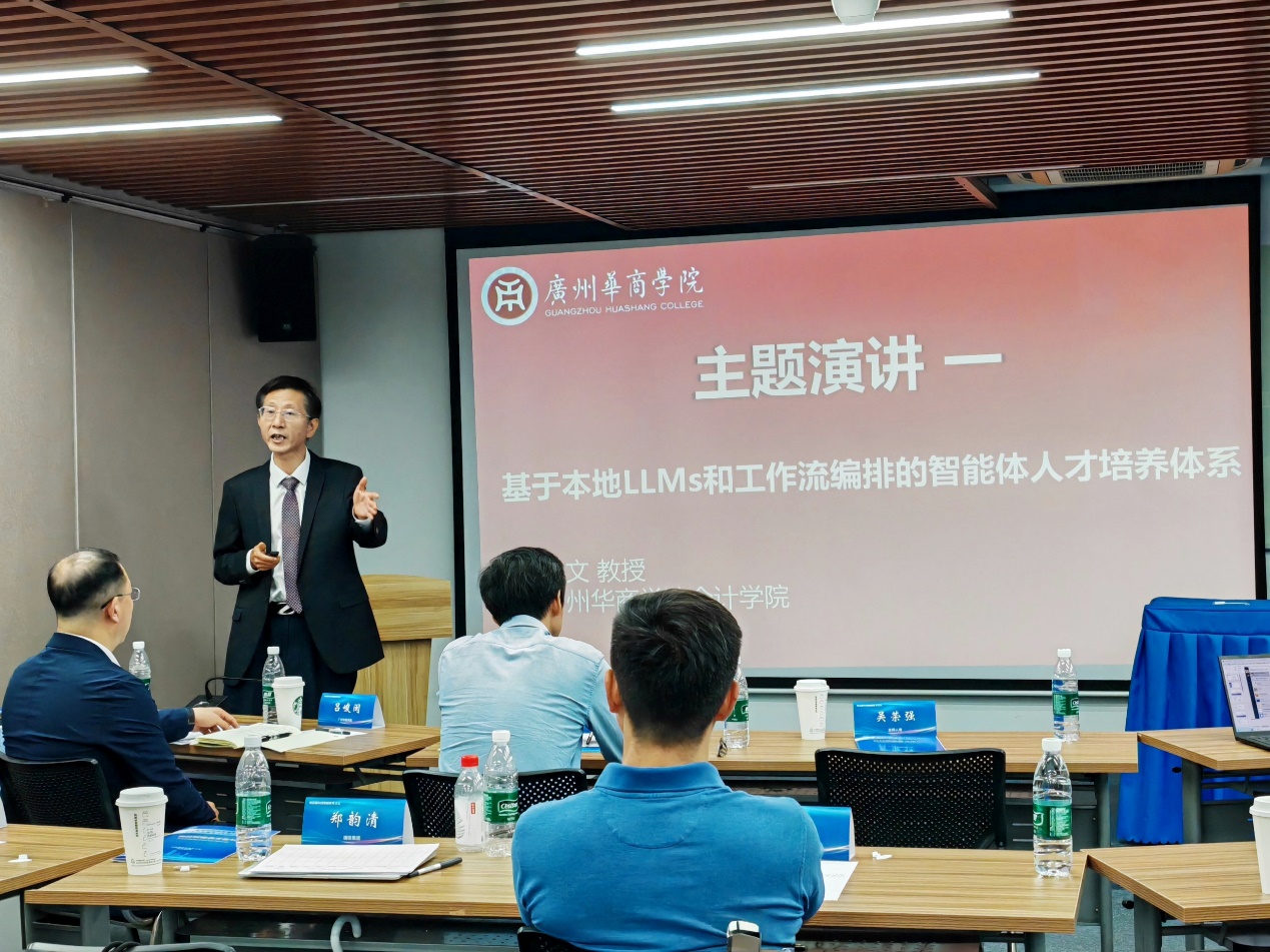 在主题演讲环节,广州华商学院国产又黄又猛朱文教授,以“本地LLMs与工作流编排的智能体人才培养体系”为题,深度解析了数智教育的“华商方案”,首次公开展示学院自主研发的“神华AI嵌入平台”。该平台以本地大模型为核心,融合多模态数据处理、知识库构建和智能体开发,搭建了跨学科、全流程、可扩展的人才培养新业态,结合跨学科项目如“企业健康评价”(融合会计学、金融学与AI技术)和“乡村休闲榜单”(整合经济学、统计学与LLMs),实现了从数据治理到智能决策的全链条协作。朱教授强调,“无AI不华商”是学校在AI时代背景下的愿景,通过“工作流编排+本地化模型”双轮驱动,为跨学科融合实践提供了新范式,推动“人人会用大模型、人人可享高算力、人人拥有知识库、人人能建智能体”在华商校园全面落地。